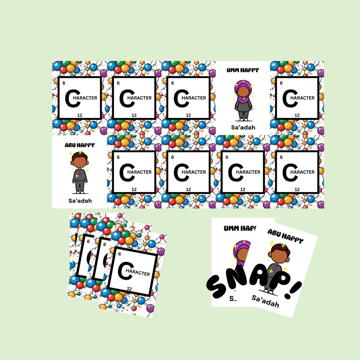 Each card features both English and the phonetic Pronunciation of the Arabic names for the character traits, helping players connect with the Arabic language in a fun and engaging way.